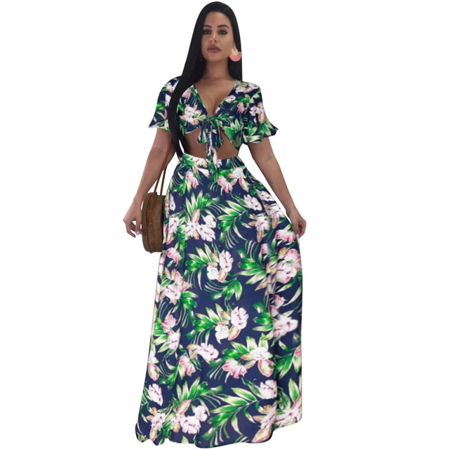 Best Price 2018 Fashion Women's Clothing 2 Psc Short-sleeved Top + Skirt Print Two-piece Suit Bohemian Beach Holiday Maxi Dresses