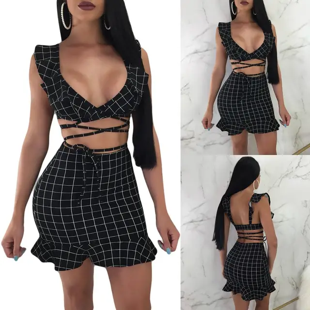 Women Lace Up Shirt Bandage Dress Plaid Checkered Deep V Neck Long Sleeve Bodycon Dress. from $ 10 99 Prime. 2.9 out of 5 stars 28. Women Two Piece Outfit Dress Suit Crop Top PU Leather Bodycon Mini Skirt Set Party Clubwear. Women Vintage Plus Szie Dress Sexy V Neck Lace Swing Dress. from $ 19 99 Prime.