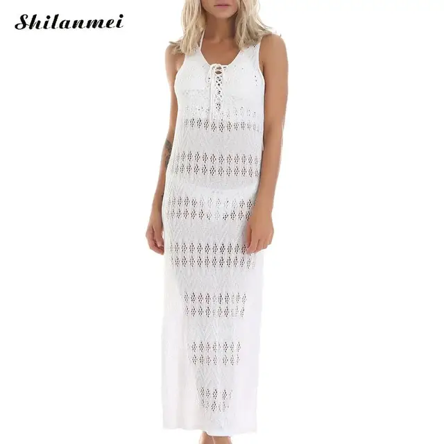 Buy - Side Slit Women's Dresses White Hollow Beach Cover Up Sleeveless Women's Tunic Long Beachwear Cover-Ups Summer Dresss for Women Best Offers