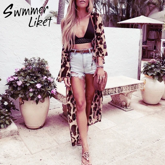 Cheap - Leopard print Kaftan Chiffon beach dress Tunic women's cover-ups Summer cardigan women Saida de beach cape dress cover up 2019 Very Good