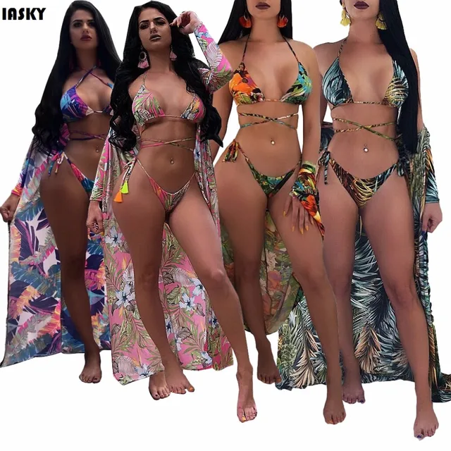 Is Better Than - IASKY 3PCS/SET Beach Cover-Ups+Bikini set 2018 Sexy Print Floral Long sleeve cover up and Bandage Bikinis women Beach wear Special Offers