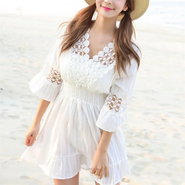 Low Price - NODELAY 2018 Summer New Young Girl Bikini Cover up Hollow Out Beachwear Pareo V-shape Collar Cover-up Lovely White Beach Dress Best Offers